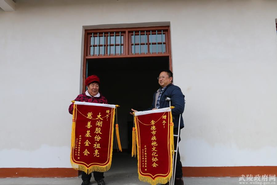 元月8日下午,在丹洲乡楠木村一幢整修一新的平房前,喜笑颜开的视力残疾老知青皮保健将两面鲜红的锦旗交到了大湖股份祖亮慈善基金与常德市旗袍文化协会代表杨其湘手中,感谢两家单位的爱心善款帮自己解决了过冬安身的大问题。